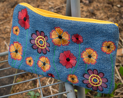 In diesem Fall nahm ich Reste einer abgelegten Jeans, ein paar Stoffschnipsel, Reißverschlüsse und Garn und verwandelte sie mit Hilfe der Stickmaschine in Frühlingsgrüße für liebe Menschen.
